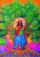 'Maternità nera' – Da poco riscoperta quella varesina, da sempre simbolo del culto popolare, la figura della Madonna Nera viene scelta dall'artista come soggetto per una personalissima interpretazione, dalle tonalità che toccano il fluorescente. La Vergine, con il Bambino tra le braccia, in una posizione che ricorda proprio la 'nostra' Madonna Nera, siede su un trono ricavato dal tronco di un albero. Simbolo iconografico della vita, che tocca con la folta chioma il cielo rossastro e impernia le robuste radici nel terreno sottostante che sembra essere la continuazione del cielo. Madonna circondata in un'aureola di colore, in una luce solare che si protrae all'infinito. 'Accogliere il cielo', recita il titolo della mostra, in un viaggio sul sottile confine che esiste tra realtà e fantasia, tra concreto ed astratto, tra finito ed eterno, tra terra e cielo.