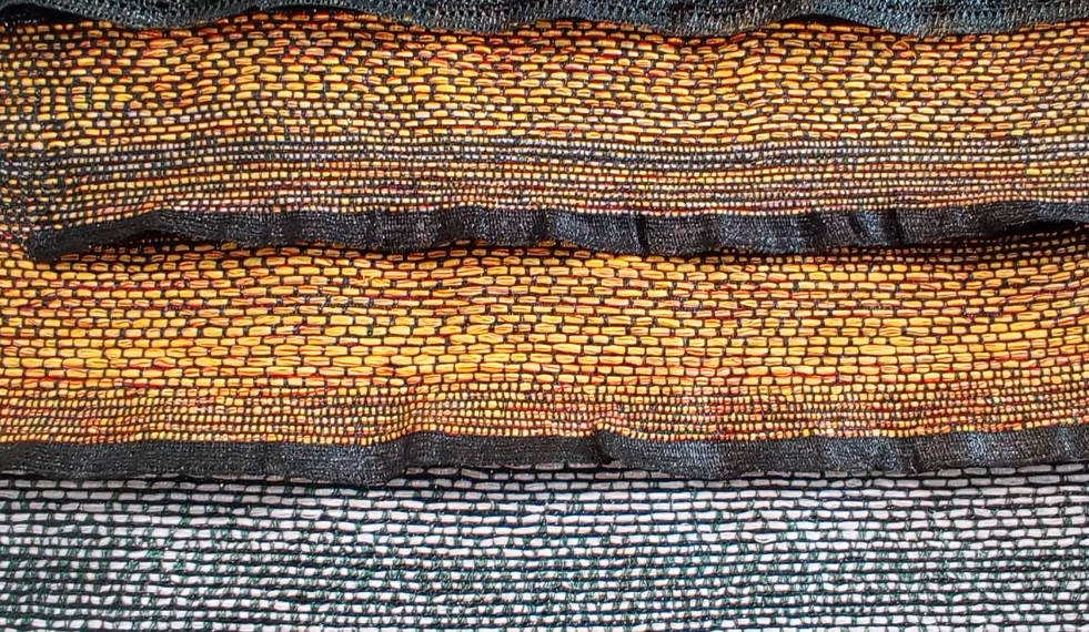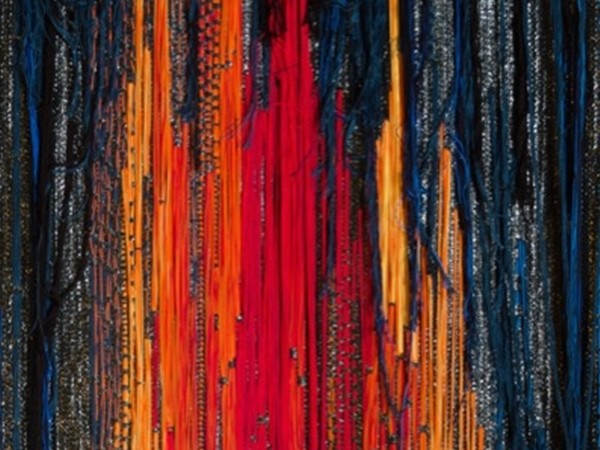 A caratterizzare l’opera della Giachetti sono anche i materiali di scarto ai quali ridona vita. Potrebbe “suonare” come la solita frase che si usa parlando di riciclo ma, in questo caso l’artista li rinobilita togliendo, come nel caso della plastica, tutta la parte negativa, “nociva”, per svelarne la bellezza. Come l’uso del poletilene, quel telo usato in giardino, che sapientemente e con pazienza lavora trasformandolo in preziosi arazzi intarsiati con migliaia di punti colorati, . Un intreccio di fili colorati che danno vita a un tessuto luminoso dove orditi e trame incontrano un vissuto fatto di storia, tradizioni, poesia e passioni.