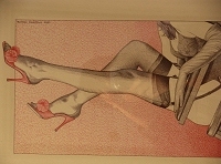 Dettagli sexy – L'erotismo delle donne raffigurate non è mai troppo esplicito o offensivo, ma anzi si avvale perlopiù del "non detto". L'artista per realizzare le sue opere parte da immagini fotografiche, che lui stesso realizza e che troviamo in un paio di esempi anche in mostra. Nel realizzare il disegno poi si concentra su un singolo particolare, che elabora per donare all'immagine quel tocco di aambientazione surreale. L'attenzione cade prevalentemente su quegli accessori che da sempre costituiscono l'immaginario sexy della donna, tra tacchi a spillo, reggicalze e corsetti.