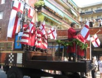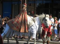 Il sole e il santo – Arriva poi la contrada di Legnarello, il cui stemma è un sole dai colori rosso e giallo: sfilano i mestieri del popolo, il fornaio, i lanaioli, i vignaioli, a ricordare il popolino medievale. Si passa poi a S.Bernardino, che ha per tema il trionfo delle armi, cioè le armi abbandonate secondo la leggenda dal Barbarossa e caricate su una portantina.