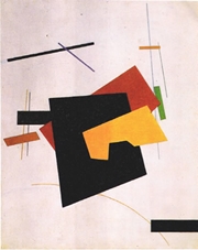 Del suprematista russo Ivan Kliun, compaiono carte dove, le sovrapposizioni multi cromatiche di differenti forme geometriche, creano continuo e vorticoso movimento.