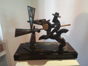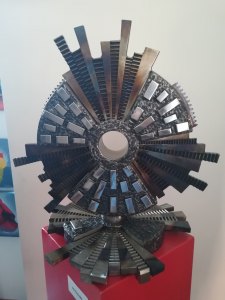 Emanuele Ascanio Favero, da un anno e mezzo legato all’associazione storica e prestigiosa della città di Varese che vede i suoi natali nel 1945, plasma materie inerti e fredde come l’acciaio, il titanio e il ferro. Parlando con lui abbiamo scoperto che è un artista autodidatta attivo fin dai tempi della scuola. La svolta per lui c’è stata a 19 anni, quando si fece regalare una saldatrice che adoperava per realizzare le sue sculture. Nella sua attività artistica – ci svela – non c’è spazio per il progetto né tanto meno per ripensamenti. Una volta che inizia a produrre l’opera Favero ha già in mente il suo aspetto finale, l’ha già visualizzata nella sua interezza. Modus operandi, questo, che lo accompagna da sempre. Fin dalla tenera età lo scultore ha avuto anche la passione per il ruotare le proprie opere. L’approdo ad una scultura cinetica è avvenuta però solo negli ultimi anni, come testimoniano alcuni dei lavori esposti a Busto Arsizio.
