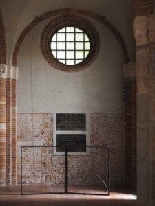 Varcata la soglia di San Celso appare “Libero Sonoro”, a riprendere il tema delle lapidi, quale costante presenza delle chiese romaniche e neoromaniche e “Libro” (1977) diretto rimando all’idea di tomba sacra.