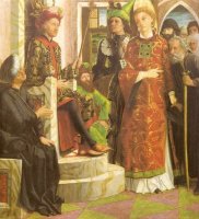La luminosità dell’ambiente permette allo spettatore di ammirare la capacità di Pacher nel rendere i particolari che vanno dagli abiti dei soggetti, fino al suggestivo chiaroscuro offerto dall’armatura del soldato. Il dialogo accennato tra le figure risulta chiaro e deciso, tanto da creare una divisione simmetrica tra le due principali che ne regolano la composizione.