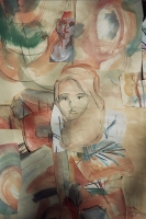 Un'opera dell'artistaOpere da assaporare – Quello che colpisce di questo artista è proprio il suo "atteggiamento da ricercatore", continua il curatore. Le sue opere hanno alla base un progetto, un idea, che poi si materializza sulla tela attraverso il gioco di olii, acrilici, tempere, pastelli. Il suo è un "dipingere planare", come lo definisce lui stesso, che avviene sul tavolo da lavoro attraverso mezzi quotidiani, e si struttura come composizione per frammenti, da cui qualvolta emergono figure dall'espressione interrogativa. Le opere, espressamente ideate per i frequentatori del locale bustese, evocano un immaginario giovanile e invitano ad essere godute nel piacevole attimo di una pausa di caffè.