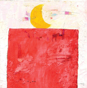 Nascono così piccole tele, immagini che solo nella mente hanno un equilibrio; aggallano e si presentano spesso gioiose: a volte velocemente accendono un’immagine dopo l’altra. […]” Il gioco si intreccia con la musica colta e popolare, con il jazz, con le canzoni e le poesie per creare una nuova armonia, “arricchita dal significato (e dal volo) delle parole e dei segni. […] Piccole stesure sono la base che copre le tele, come fettucce distese. Una pennellata continua, solo bianco, all’inizio; una striscia bianca compatta, che lascia rilievi, piccoli strati più elevati […]. Il canto ascoltato, le parole ripetute, le note espresse dagli strumenti che lo circondano, il sorriso del nipotino, sono lo stimolo; senza un percorso preciso. […] Con i gialli e i rossi che si distendono come un nuovo lenzuolo colorato che copre il bianco”.