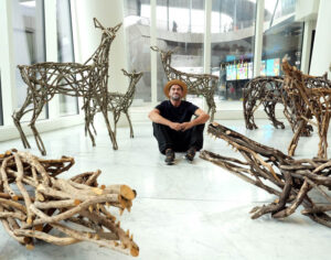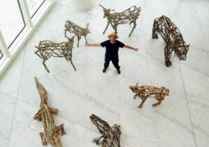 Nei lavori l’artista, che dà vita a sculture strabilianti con materiali di recupero come rami secchi e foglie, elimina ogni infrastruttura tra l’opera e l’osservatore finale e il legno diventa il medium con cui realizza creature che dialogano con l’ambiente in cui sono inserite: figure familiari e riconoscibili che interagiscono con il paesaggio e con chi quel paesaggio lo vive.