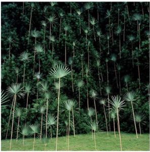In “Sequoia Piece”, l’artista fotografa la sua installazione dove armonicamente fa convivere l’energia, la forza, l’immensità delle sequoie con la delicatezza, l’eleganza e la caducità delle foglie di palma, piantate appositamente intorno, sopra e sotto gli imponenti alberi secolari. Udo è un noto rappresentante del movimento Art in Nature. La sua indagine si concentra sul legame inscindibile tra condizione umana, identità personale e perfezione della natura, dando vita a installazioni a volte immense, oppure al contrario quasi miniaturizzate. Sono lavori in continuo mutamento, che subiscono il cambiamento del ciclo biologico sui quali la natura poi interviene.