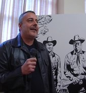 Walter VenturiDalla vignetta alla realtà – Il primo tiene in mano il microfono con la disinvoltura di una stella della musica pop, il secondo si immagina alla scrivania come un alieno. Loro sono Walter Venturi e Massimiliano Leonardo, in arte Leomacs, i "soliti sospetti" protagonisti della grande manifestazione che sta catalizzando l'attenzione di amanti del genere fumettistico e non. Un allestimento semplice ed essenziale in uno dei poli culturali più attivi ed interessanti della Provincia (leggi Spazio Frera) permette di ammirare una carrellata di disegni di questi due talentuosi e simpatici autori.