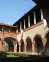 Veduta del chiostrovano diviso in tre navate da colonne in cotto. Spiccano in facciata il portale e il rosone, decorati con terrecotte finemente lavorate.
