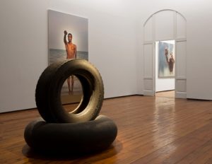 I due copertoni posti al centro dello spazio espositivo, a seconda di dove ci si pone, incorniciano a pezzi i corpi, nascondendone alcuni tratti definendo così la mutevolezza del parziale.
