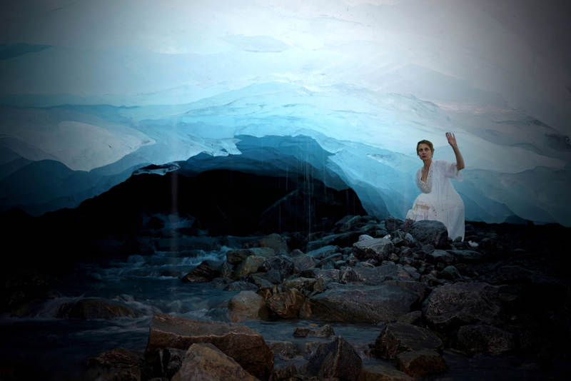 La protagonista dell’opera shakespeariana che sprofonda nelle acque di un torrente, qui rappresenta l’allegoria di una natura abbandonata dall’uomo che con le sue azioni forsennate provoca il surriscaldamento del pianeta e la morte dei ghiacciai. Questo, una volta trasformato in massa d’acqua, tracima a valle e confluisce nel lago dove l’Ofelia di Brunelli si avvia alla fine. L’interprete, negli scatti del servizio fotografico effettuato tra settembre e dicembre 2019 sulle pendici del ghiacciaio del Ventina in Valmalenco, nelle vicinanze del torrente Lanza a Valmorea (Como) e a Domaso, sulle sponde del Lago di Como è l’attrice Sonia Cucco.