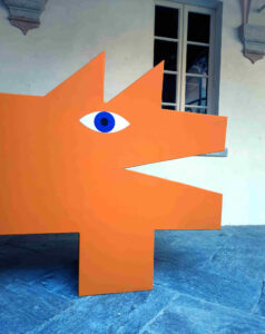 Colori primari, una giungla di forme rigorose e un fitto mix di riferimenti artistici, da Depero a Picasso, senza dimenticare Enrico Baj e l’immenso Ambrogio Pozzi. Si può davvero affermare che Oggian cammini sulle spalle dei giganti, inserendo spesso nei suoi lavori la forma di una pupilla geometrica ed essenziale, una sorta di metafora dell’occhio che tutto vede, ma nulla coglie.