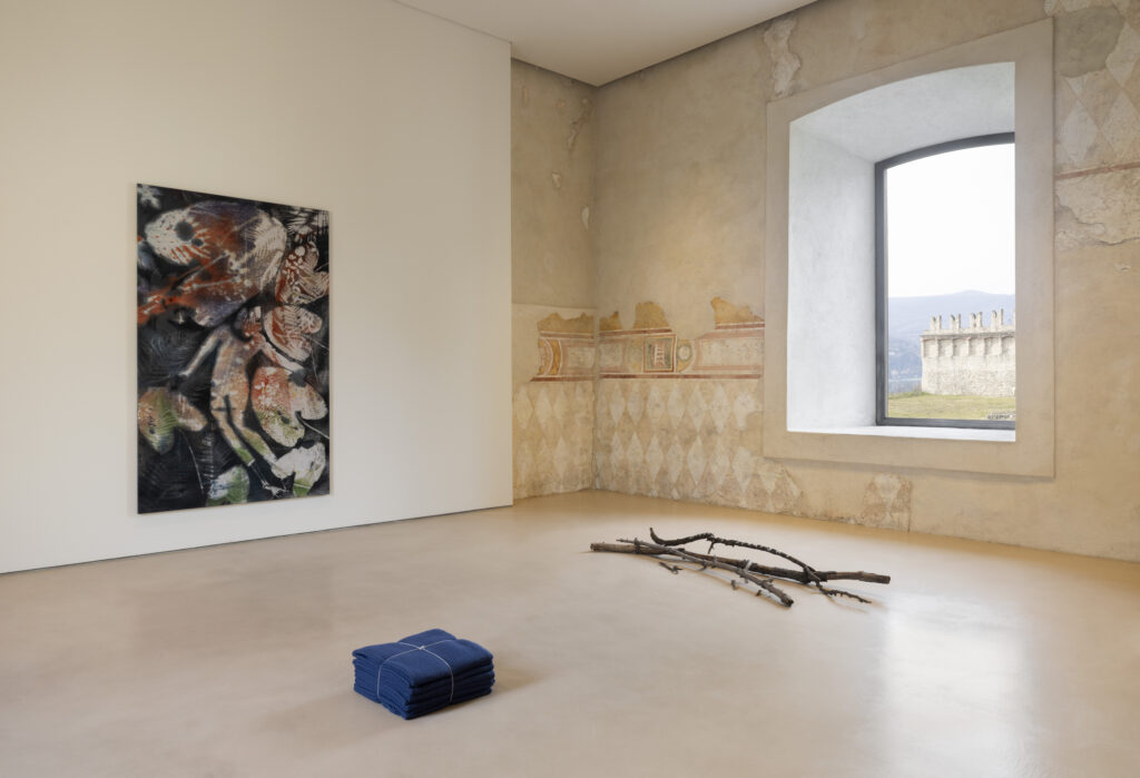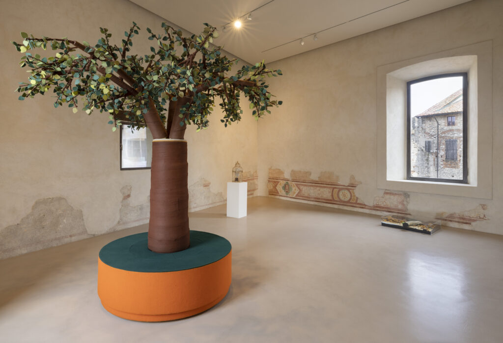 La mostra si chiude in un dialogo tra l’albero che accoglie le persone di Lara Favaretto, i tappeti naturali di Piero Gilardi e il ricamo da tombolo di Francesco Vezzoli, con soggetto una famosa tela di Fragonard, che dialoga con la classicità messa in gabbia come fosse un animale esotico. La natura entra direttamente nell’edificio e i materiali usati dagli artisti divengono antitetici agli elementi naturali che circondano la rocca facendo sì che non ci sia quella sparizione dell’espressione e del pensiero di un tempo come è stato nel passato quando si usava costruire tutto in legno o altri materiali deperibili.