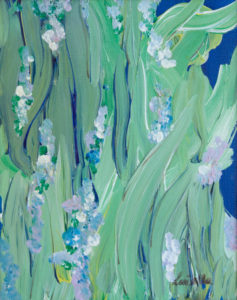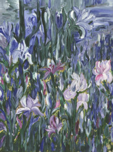 Oltre il giardino segreto, si ispira liberamente a The Secret Garden, romanzo scritto nel 1910 che narra la storia di un meraviglioso giardino segreto, reso inaccessibile, in cui venivano coltivate delle rose. L’autrice, Frances Hodgson Burnett, era appassionata di giardinaggio e considerava questa attività pedagogica e terapeutica, sia sotto il profilo mentale sia sotto quello fisico. La pittura ha avuto il medesimo ruolo per la nostra artista: un’attività cui si è dedicata parallelamente a tutti gli altri impegni che hanno occupato la sua vita, e che è stato un luogo segreto in cui ritirarsi, coltivandolo man mano. Fiori di magnolia, iris, viole, ortensie, petunie e papaveri sono solo alcuni dei fiori che si incontrano in mostra, incastonati in un allestimento verde, fatto di piante che circondano le immagini. La predisposizione alla cura del verde è la precondizione che avvicina spontaneamente l’artista alla disciplina quotidiana della pratica pittorica, in un approccio simbiotico tra le due dimensioni.