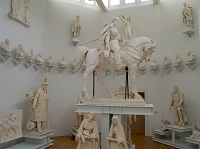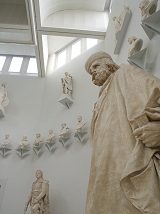 Un'opera espostaParola di direttore – Il nuovo allestimento del "pezzo forte" della villa appare ben illustrato nella riflessione di Gianna Mina, direttrice del Museo Vincenzo Vela: "Considerata la loro mole – spiega – le opere esposte al piano terreno non possono essere intercalate con altre conservate in deposito. Le dimensioni dei gessi colossali sono infatti tali da rendere impossibile presentarli altrove che non in questo spazio ottagonale centrale, ideato dallo scultore stesso con questa precisa funzione, quella di museo privato, pensato come opera d'arte a sé stante. Si è quindi deciso di arricchire questo allestimento permanente attraverso la creazione di un terzo registro di sculture inedite, disposte sopra la corona di busti-ritratto. A questo scopo sono stati scelti soprattutto bassorilievi di grandi dimensioni – in prevalenza funerari e di tenore risorgimentale, tutti di grande qualità plastica – e tre statue a grandezza maggiore del naturale, due opere facenti parte del monumento Brunswick, la terza un'allegoria politica ("L'Italia dei martiri"). In questo modo viene rafforzato il concetto espositivo originale, che prevedeva un audace condensato di straordinaria – e oggi improponibile – densità, ove fossero presenti tutti i modelli monumentali dell'artista, che andavano così a creare quel "pantheon" della storia risorgimentale, che ancora oggi stupisce e affascina i visitatori".