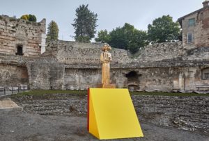 Un ideale ellisse temporale unirà, nel parco Archeologico, vestigi romane alle opere contemporanee dell’artista per un allestimento ideato e curato da Filippo Bisagni a definire un percorso che, iniziando dalla terrazza del parco e dalle prime due celle del Capitollium, proseguirà nel Santuario Repubblicano arrivando al teatro Romano per procedere sino alla cappella Sant’Obizio presso la Basilica di San Salvatore poi, nella Domus dell’Ortaglia e lungo la sezione romana del museo, non disgiunta dagli spazi del sito Unesco iscritto nella World Heritage List dal 2011 nel sito seriale” I longobardi in Italia i luoghi del potere” (568 – 774 d.C.).