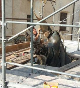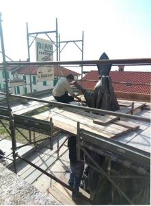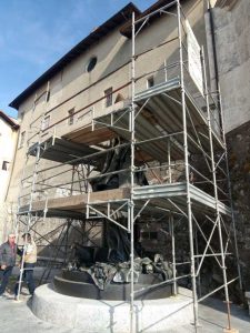 «La statua è stata realizzata da Floriano Bodini nel 1985. – spiega il responsabile dei lavori Francesco De Andreis – E’ stata fusa a pezzi alla Fonderia Battaglia e poi trasportata sulla cima del Sacro Monte, montata e installata. Nel corso degli anni si è accumulato uno strato residuo dovuto agli agenti atmosferici, che hanno scurito e intaccato il bronzo. Il mio è un intervento di tipo conservativo, che donerà nuovo splendore all’opera».