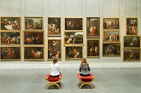 Una foto in mostraSimmetria e geometria – Una veduta notturna dove un uomo vestito di giallo, con una pipa in bocca si appoggia ad un muro, sotto un lampione. Di fronte a lui il Battistero, lo storico edificio coi suoi preziosi bassorilievi che oppone il tono monocromo delle sue pareti alla vivacità dell'abbigliamento del signore. Poi due vedute della Galleria Nazionale: una in cui la prospettiva conduce l'occhio lontano alla ricerca di una piccola statua posta al centro, lontana, mentre due sculture di grandi dimensioni si trovano faccia a faccia in primo piano; l'altra dove i quadri appesi alle pareti, contemplati da due giovani di spalle, vengono proposti in perfetto ordine, una suddivisione geometrica che coinvolge anche le spettatrici. Poi la lunga sala della Biblioteca coi suoi banconi di vetro che si ristringono perdendosi sul fondo.
