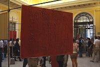 Riccardo FocacciRiccardo Focacci ci confida di avere tre "lavori": è tatuatore, artista e soprattutto un premuroso papà. Tutti impegni, che poi sono piaceri, a cui lui si dedica con grande passione e costanza. Le sue opere esposte a Palazzo Borghi ci accolgono prorompenti, cariche di rossi aggressivi che trasmettono forza ed energia, non certo inquietudine. Poi, se ci si avvicina, si può scoprire che queste nascondono oggetti di ogni genere: pennelli, bottiglie, lettere dell'alfabeto e chissà che altro. Sono letteralmente ricoperti dallo smalto rosso, una copertura esterna, quasi a mascherare la vera interiorità dell'opera. E poi c'è la resina, che copre tutto come glassa, come gelatina. Ma se la tocchi è dura come una roccia, forte come una corazza.