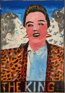 Tra le opere in mostra spicca l’omaggio dedicato a Elvis Presley, non a caso intitolato “The King”.