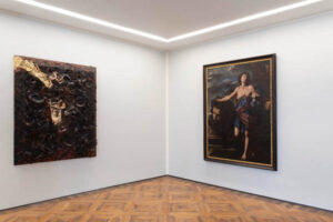 La seconda parete è dedicata alla pittura barocca, in cui il tema della decapitazione trova fortuna a partire dalle invenzioni caravaggesche per essere enfatizzata successivamente in declinazioni che arrivano al tenebroso e al macabro, come nelle tele che derivano dall’Erodiade di Francesco Cairo. In mostra tre esemplari derivanti dall’originale del pittore lombardo conservato ai Musei Civici di Vicenza. Sempre legate al tema dell’ossessione e della ripetizione, nelle prime due sale troviamo alcune sculture in legno e marmo del cinque e seicento raffiguranti teste mozzate, come la testa di giovane martire attribuita a Domenico Poggini, o la reinterpretazione in chiave moderna di Bertozzi&Casoni, dove la figura del Battista è sostituita da quella di un gorilla. La ripetizione ossessiva è riprodotta sulle pareti, in