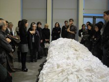 La visita guidata alla mostraspessore presentati a Gallarate: lo strepitoso Augustian Melody messo in scena dalla Societas Raffaello Sanzio: una sorta di immenso sudario, dal quale percolano parole sussurrate, un racconto intessuto e lacerato, per poi essere nuovamente ricomposto.