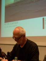 Scoprire Zumthor – Frasi brevi e lunghi silenzi, sottili battute e risate contagiose: così la presentazione del maestro è stata ascoltata in religioso silenzio anche quando le immagini senza commento di sottofondo scorrevano in un veloce susseguirsi. Caratterizza Zumthor la passione per un'architettura concreta e, allo stesso tempo, poetica, fatta di conoscenze costruttive, di sensibilità e competenza nell'uso della materia, di coerenza nel disegnare e pensare lo spazio anche attraverso l'uso sensuale di luce, materiali, colori. Tra i capolavori pubblicamente ricordati: i Bagni termali di Vals in Svizzera (1986-1996), la Cappella Sogn Benedetg a Sumvitg, la Galleria d'arte di Bregenz, il Padiglione svizzero all'Expo 2000 di Hannover, il Museo d'arte Kolumba a Colonia, la Cappella Bruder Klaus a Wachendorf.