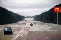 Un’opera di Andrea Mattoniparticolare. Un grappolo d'uva adagiato su di un piatto (parte di un ciclo di vegetali scolpito) del varesino Alberto Tognola si fa cibo dell'anima, veicolo comunicativo di usi e comportamenti, rimandando concettualmente ai riti pre-cristiani della fertilità. Il piatto in carta e filo, realizzato da Eliana Galvani di Daverio, trae spunto da una frase di Gianni Sassi e si sofferma sull'ambivalente senso del piatto di poesia: simbolo del rituale del mangiare e simbolo dell'arte come nutrimento dell'anima. Nell'immaginario ironizzante del giovane Andrea Mattoni la favola del cibo moderno è una strada americana a sei corsie, dove, nonostante la fitta nebbia, emerge prepotentemente l'insegna del Mc Donald's, il fast food, simbolo emblematico del consumismo, del mordi e fuggi, che domina anche in assenza di visibilità naturale. Nel piatto nero ricamato con filo, da cui emergono le pietanze rigorosamente di colore nero, si profila un altro affascinante discorso intorno al cibo, quello di Mariuccia Secol: per lei, abituata a mangiare poco da sempre, è pura esteticità, evidenziata dall'eleganza della materia e della scura cromia tanto care all'artista. Il modus operandi si fa fluido e inafferrabile, invece, nelle opere dei giovani Michelangelo Jr, Loriana Castano, Valeria Magli, la ballerina dei poeti, e del fotografo Fabrizio Garghetti. Tante altre ancora sono le letture del cibo in arte, tante quanti sono gli artisti chiamati da Milli a festeggiare il centenario della pasticceria Taveggia.
