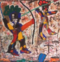 Al di sopra del tempo – "Un concetto estremo che lo sguardo coglie in un immagine-messaggio su di un confine che oltre essere materiale è anche temporale e spirituale. Su questa dimensione espressiva si definiscono i ruoli delle figure risolte nella semplicità di un discorso bidimensionale. I soggetti vivono di tratti decisi e colori assoluti, neri, rossi, verdi, lasciando emergere una coerenza di linguaggio che lega il gesto emotivo al colore e al ritmo grafico conseguente al disegno. Un primitivismo metropolitano, nobilitato dall'intuizione dell'artista, che sente fortemente la sostanza di cui si compone l'opera. Sono immagini che