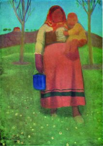 La primavera artistica di Montanari si specchia proprio nel quadro che abbiamo scelto, come nota puntualmente Luciano Gallina: «Abbiam visto una contadina, con un bimbo in braccio, su un prato verde smaltato di margherite, opera del 1914, ancora per alcuni versi cruda e imprecisa, ma già indicativa dell’indirizzo futuro per quel suo fermentante humus cromatico, per il coraggio di quel tappeto verde e di quella fioritura azzardata da rammemorare – in qualche misura – il coraggioso e melodioso naturalismo degli antichi pittori marchigiani o, addirittura, una trasposizione in linguaggio gentile».