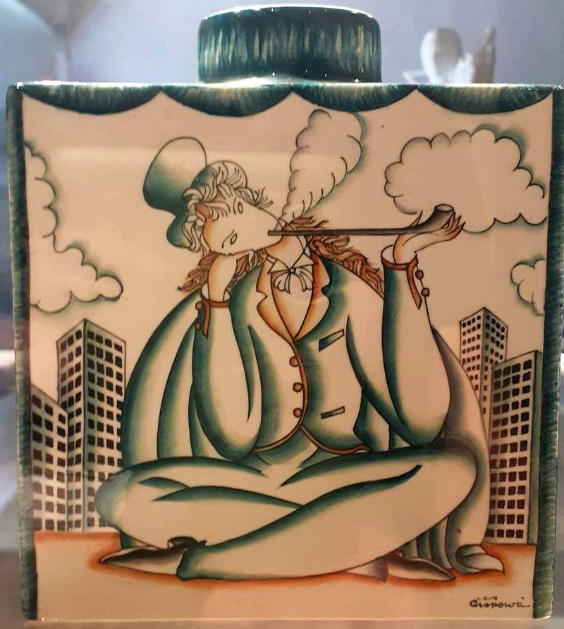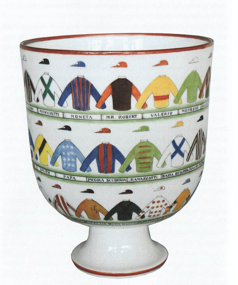 Nella mostra non mancano ovviamente le forme da lui molto amate di anfore, urne e vasi con decori suggeriti dalla mitologia e dall’archeologia e allettevoli, appaganti sorprese tra cui, almeno per me, la “Coppa dei fantini” con la sfilata vivida delle giubbe colorate delle gloriose scuderie del tempo. C’è anche la verde e bianca della Modrone, quella di Luchino Visconti.