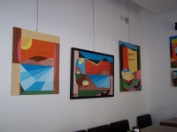 Le opere in mostraPuzzle di colori e forme – Le opere esposte nella galleria del bistrot della Biblioteca Frera di Tradate sono dai colori vivaci e caldi. Predominano l'arancio e il blu in tutte le loro infinite tonalità, e altri colori dalla cromia naturale. Stesi magri e piatti danno forma a figure geometriche, triangoli regolari, forme cuvilinee che si intesecano fra loro come puzzle e disegnano una barca immersa in un mare reso come sfaccettature di un diamante, oppure creano una figura d'arlecchino che nasconde un volto di donna. Sono vivaci gli accostamenti di colori e la composizione che cerca un'astrazione nella forma geometrica, ma non si libera della tridimensionalità dello spazio reso con i cambiamenti tonali del colore acceso.
