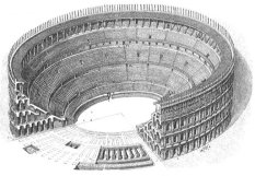 Ricostruzione dell'anfiteatro di Milanoseguito a ricerche sul campo. L'aspetto dell'anfiteatro doveva essere di grande impatto: una loggia porticata al pianterreno, una facciata a tre ordini architettonici per una altezza complessiva di 38.40 metri, con una successioni di capitelli dorici, ionici, corinzi e attico fenestrato.