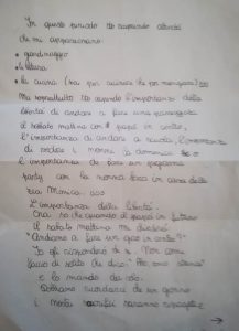 In questo periodo sto scoprendo attività che mi appassionano: giardinaggio, la lettura, la cucina (sia per cucinare che per mangiare). Ma soprattutto sto capedo l’importanza della libertà di andare a fare una passeggiata il sabato mattina con il papà in centro, l’importanza di andare a scuola, l’importanza di vedere i nonni la domenica o l’impotanza di fare un pigiama party con la nonna Sara in casa della zia Monica. L’imortanza della libertà.