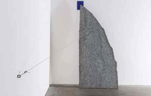 Punto focale dell’esposizione appare essere “Verso oltremare” (1984) dove una forma irregolare di granito è tenuta in equilibrio da un cavo d’acciaio ad affermare una temporanea stasi, mentre la punta estrema del blocco marmoreo indica un controllato spazio di intenso blu, come un Aleph quale emblematico valore di ideale lontananza.