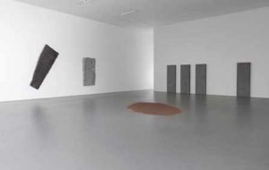 Giovanni Anselmo (Borgofranco d’Ivrea 1934, vive e lavora tra Torino e Stromboli) accosta, con minimale regolarità, alcune lastre di pietra al fine di condurre il visitatore ad un rigoroso processo meditativo, ma anche a un religioso momento di preghiera, condizioni tese a stabilire uno stringente rapporto tra l’umano e il trascendente.