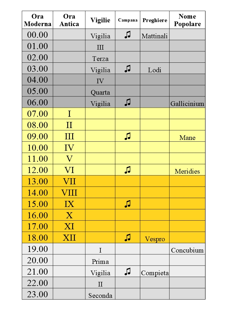 I vari momenti del giorno e della notte erano scanditi, soprattutto per i monaci, oltre che dal lavoro e dal riposo, dall’obbligo di recitare determinate preghiere. In questo periodo fanno la loro apparizione le prime campane, le quali, oltre ai religiosi, avvisano pure il resto della popolazione circostante dell’ora ufficiale: preoccupazione superflua, penserà qualcuno, visto che nessuno ha ancora al polso un orologio da regolare.