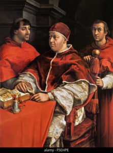 Lo scritto, fortunatamente rimastoci nelle stesure sia di Raffaello, sia del Castiglione, aveva lo scopo di prospettare, e anche risolvere, i problemi relativi alle “antiquitate” di Roma accertati dal pittore soprattutto dopo il 1515 quando, nominato dal pontefice “praefectus marmorum et lapidum omnium”, di esse diventò “assai studioso…havendo posto non piccola cura de cercharle minutamente e misurarle con diligentia”. Dopo questa premessa Raffaello nella lettera rileva, dolendosi, che “quelle famose opere che hoggidì più che mai sarebbero florenti e belle forno dalla scelerata rabbia e crudele impeto di malvaggi homeni, anci fiere, arse e distrutte”, non esitando ad annettere fra i “malvaggi” anche predecessori di Leone i quali “hanno atteso a ruinare templi antiqui, statue e archi et altri aedifici gloriosi…solamente per pigliar terra pozzolana”. (nella foto:Raffaello, Ritratto di Leone X con due cardinali).