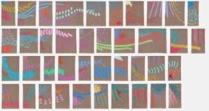 La continua successione di segni, trame colorate, libere grafie, sinuose ondulazioni, eseguite su tele grezze non preparate e libere da intelaiature, tendono a cadenzati moti cinetici e tratti che portano dalle scritture rupestri sino a micro circuiti stampati riconducibili a un futuro prossimo.
