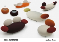 Supersassi 2000equilibrio e armonia: da "Confortevole" (1939), uno dei primi prodotti ‘seduta-letto', a "Garden Bay" (2010) del designer Willem Brouwer, un sistema di sedute outdoor complete di tende parasole. Prestigiosi nomi del design collaborano con la Rossi di Albizzate nella progettazione di significativi pezzi di arredo: Vitelli e Ammanati, Carlo Bartoli, Hans Von Klier, Claudio Salocchi, AdamTihany, Matteo Thun. Quest'ultimo lancia nel 2000 la linea dalle forme sferiche "supersassi" esposta nel 2002 a Soft Design alla Biennale di Venezia. Nel 2004 i giovani designer Pio e Tito Toso realizzano le sedute "Dondolo", "Dondolino" e "Dondoletto": curiose, spiritose e pluripremiate, oltre che prescelte in parecchie forniture.