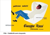 Pubblicità Anni CinquantaMostra in azienda – Non tutta l'arte si trova nei musei. A volte, come in questo caso, arte e impresa si intrecciano in maniera inscindibile. Accade quando arte fa rima con sofà e scrive una pagina della storia del design italiano. E' quanto avviene da 75 anni all'interno dell'azienda "Rossi di Albizzate", marchio storico nella produzione di sedute e imbottiti. Fondata nel 1935 da Giuseppe Rossi unitamente alla moglie Maria Saporiti, oggi l'impresa, guidata dai figli Luigi e Piero, festeggia i suoi 75 anni di attività, condotti nel segno di un costante impegno: lavoro, evoluzione, ricerca, creatività e altissima qualità. Ad ottobre presso la sede di Albizzate è stata inaugurata la mostra dei modelli che hanno fatto la storia dell'azienda, corredata con immagini fotografiche.