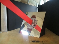 Il colpo d'ala – Villa Baragiola trasformata. Riacquista improvvisamente la dimensione del progetto estetico e culturale, dopo essere stata, utilmente, funzionalmente riservata alla gestione degli uffici comunali. Un colpo d'ala in questi giorni la porta in altri territori, attraverso i due archi trionfali metallici con i grandi stendardi trionfali che faranno da primo passaggio al 'pellegrino', all'ingresso del parcheggio, fino ad arrivare alle colonne posizionate proprio a ridosso della Stecca; unite da un motivo rosso, il corso della storia, che zizgaga, che va ad infrangersi contro una colonna in stile dorico, spezzata, fino a culminare in un colpo di teatro ancor più spiazzante, l'ulteriore passaggio 'iniziatico' del pellegrino: una grande orologio fotografato su una superficie di specchi. Il tempo si ferma, la storia è fissata, ora comincia il racconto vero, nel pieno del silenzio e dello stupore.