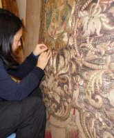 Curare dall'interno – Le due facce dello stendardo sono state scucite per poter intervenire sia strutturalmente sia per poter giungere meglio a operare ad ago. I numerosissimi ricami metallici sollevati sono stati riposizionati uno ad uno e fermati ad ago con punto tela; le laminette sollevate e arricciate sono state distese e fermate con punto posato; le scuciture dei ricami applicati imbottiti sono stati ricuciti; i filati sono stati riposizionati e fermati attivando la resina col calore.