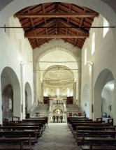 L'interno, austero e spoglio, è a tre navate e diviso in cinque campate irregolari ed è dominato da un ampio presbiterio sopraelevato, in cui si inserisce un semplice coro e l'ambone, databili alla seconda metà del XVI secolo, a cui si accede tramite una doppia scalinata. L'abside risulta costruita con una tecnica accuratissima, tramite l'alternanza di pietre bianche e nere che decorano l'ambiente.