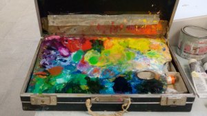 Bellissima la valigetta del pittore, strumento di lavoro indispensabile e coloratissimo che accompagna Bardelli in ogni luogo del mondo.
