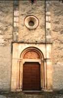 Ingresso dell'edificioTutto l'edificio è coronato da un'elegante cornice in cotto con modanatura, sostenuta da un motivo ad archetti a sesto acuto che insistono su dei peducci anch'essi in terracotta e che si stagliano contro un alto cornicione ad intonaco. La facciata con profilo a capanna e tripartita dalle paraste è caratterizzata da un portale recante stilemi e decorazioni tipicamente romaniche che riquadra un finto protiro arcato, trabeato in sommità. Poco sopra si aprono un oculo strombato in pietra d'Angera incorniciato in cotto e un'apertura a croce che si ripete sul lato posteriore.