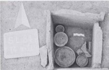 Vaso da miele, disegnoforma circolare, di cui si conservavano parti del rivestimento interno delle pareti. Fra gli oggetti in ceramica, sono stati rinvenuti frammenti di olle, ciotole, di uso domestico; la presenza di fusaiole, usate per filare la lana e di un frammento di colino, usato per produrre il formaggio, permette di ipotizzare attività artigianali, come la tessitura e la produzione casearia.