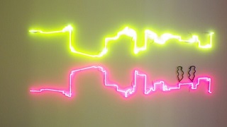 Poco prima ad accogliere il visitatore, posata a terra a mo di sipario, i profili delle architetture di New York permettono, pur rimanendo con i piedi per terra, un ironico sguardo dall'alto.
