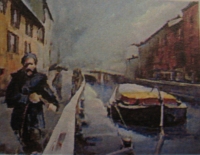 L'uomo del barconeDalle figure deformate all'impressionismo malinconico – La sua carriera, iniziata all'Accademia di Brera, dove giunse dall'originaria Valle Agordina in giovane età, fu proficua e fortunata come dimostrano le sue numerose opere presenti in diverse collezioni pubbliche e private, italiane ed estere. Dalla produzione delle prime opere, nelle quali la figura umana, a detta dei critici d'arte, veniva "immensificamente deformata", Enrico De Col in età matura giunse alla realizzazione di dipinti, nei quali maschere, fioraie, donne allo specchio e navigli milanesi vengono espressi in uno stile impressionista velato di malinconia.